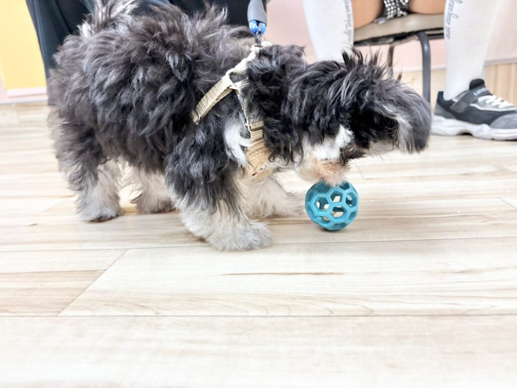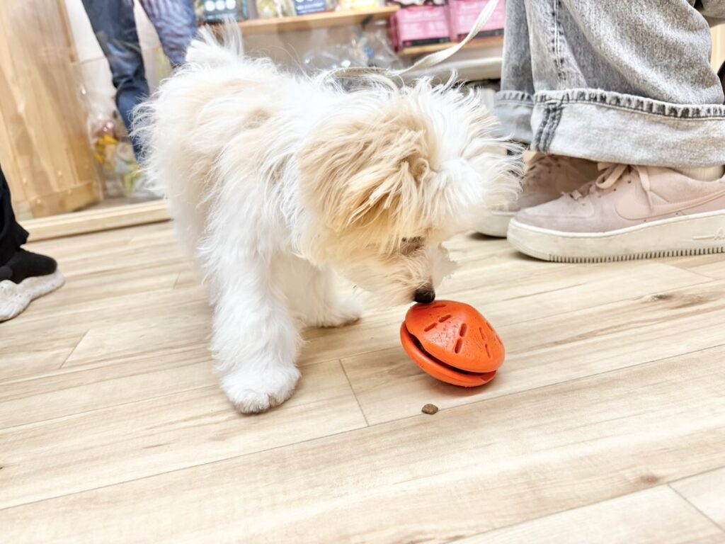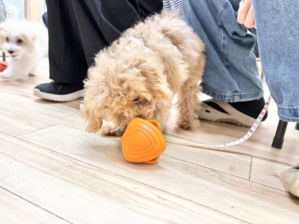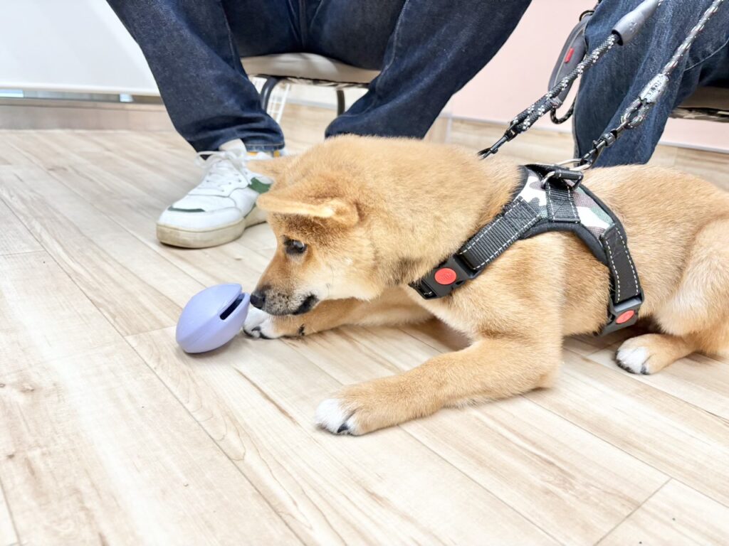 知育玩具も一生懸命咥えておやつを取ろうと頑張っていました♪