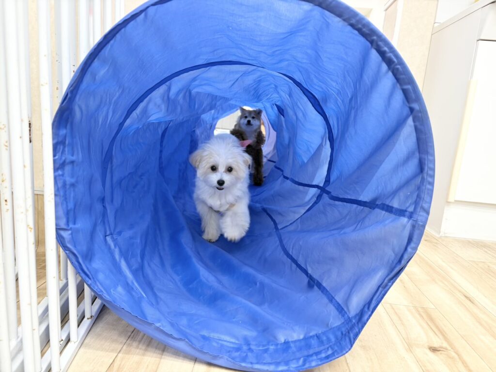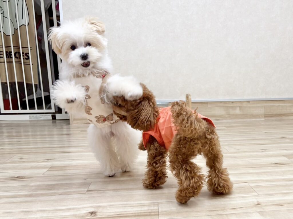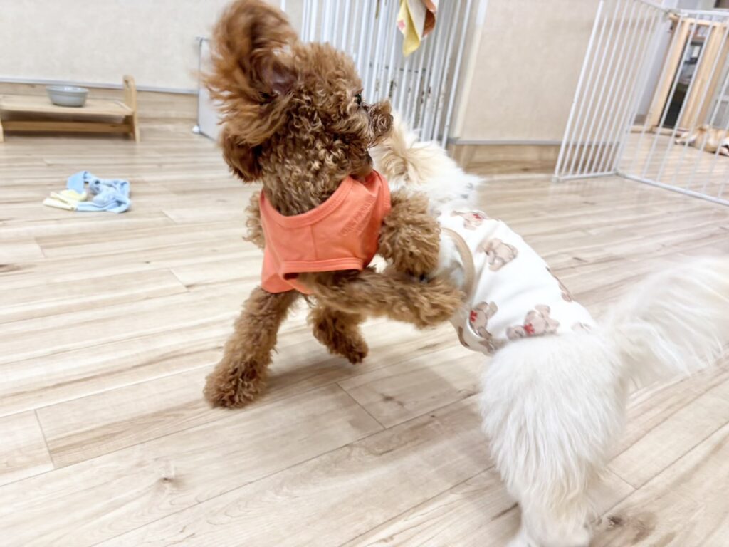登園2日目。ここちゃんのことが気になる【トイプードル】のプラムちゃんは元気いっぱいに遊びを誘います!でもまだ少し緊張していて誘われていても戸惑っているここちゃんでしたが、誘いを諦めなかったプラムちゃんのおかげで、、、。