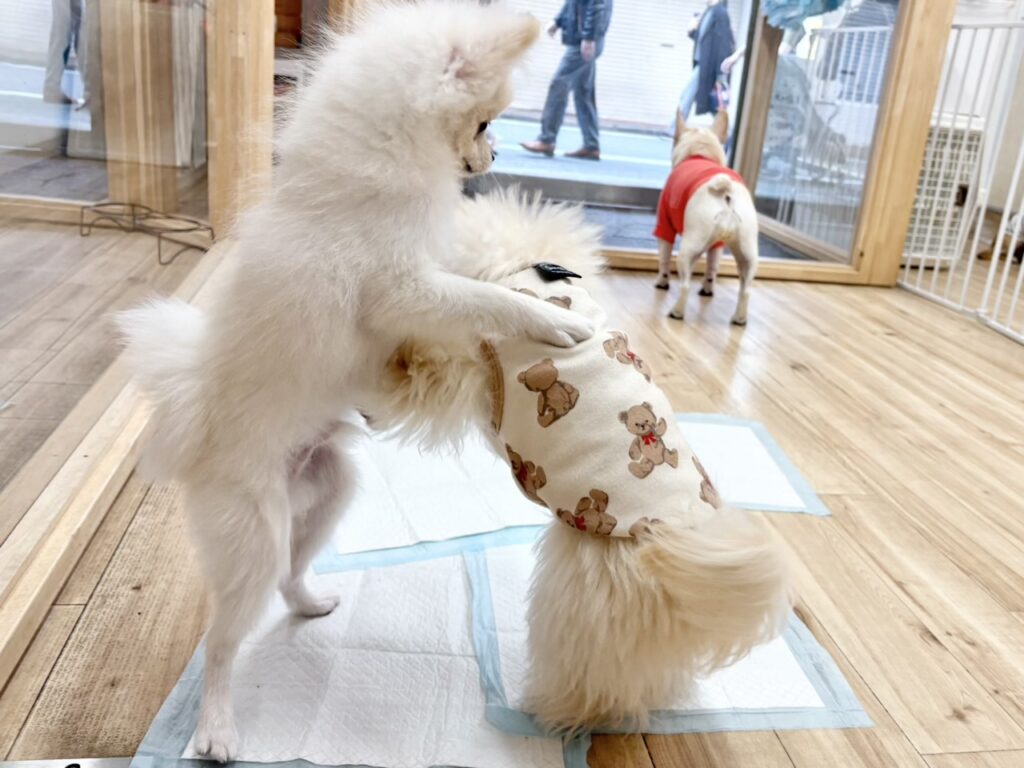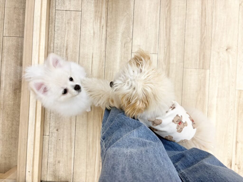 【マルプー】のここちゃんは【ポメラニアン】のポンくんに手で『あそぼーよ』とちょんちょんしていて見ていて可愛かったです^ ^